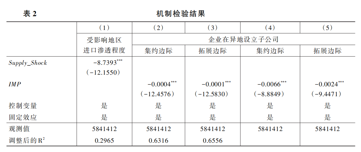 (2)将被解释变量对机制变量进行回归:城市进口渗透程度的降低增加了异地企业前往本地设立子公司的数量和概率。