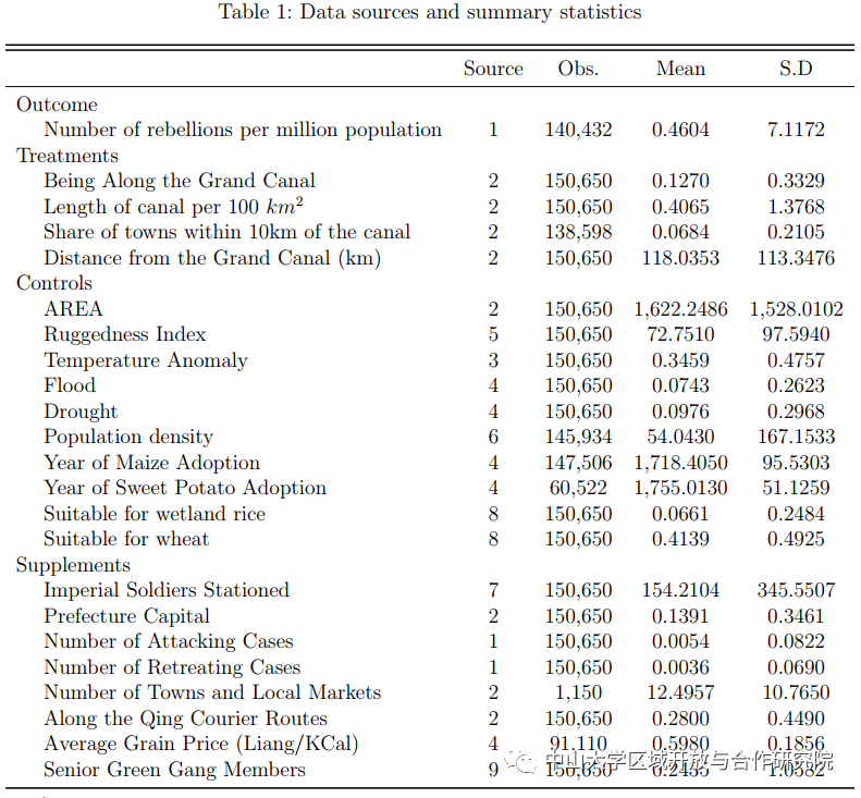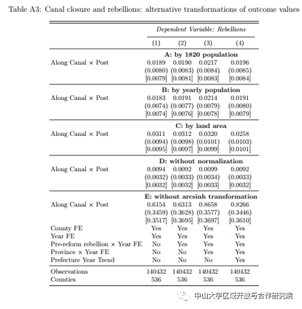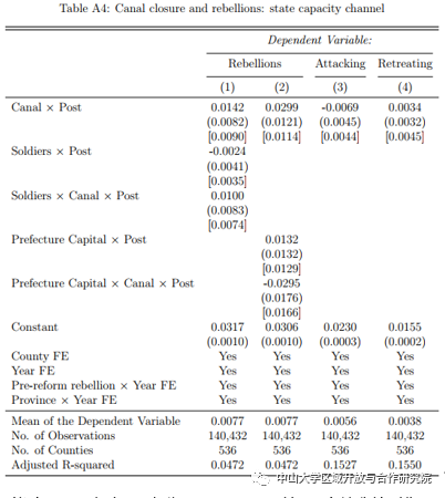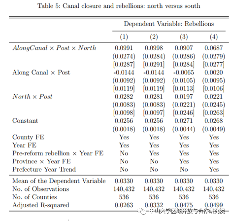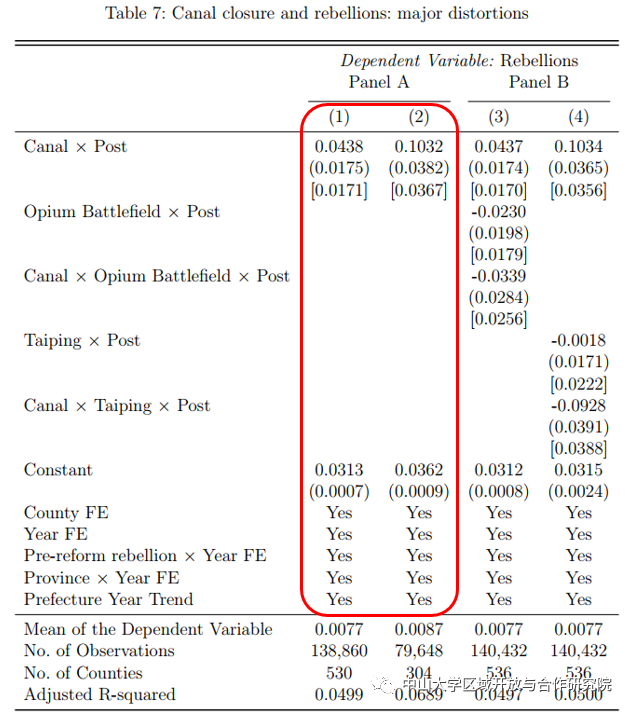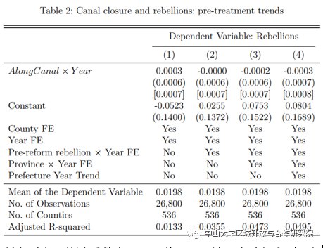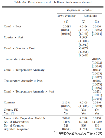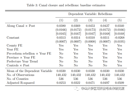 第一列系数为0.038,则表明冲击后运河县每百万人口增加了exp(0.038)-1=0.0387次叛乱。第五列加入Controls ❌