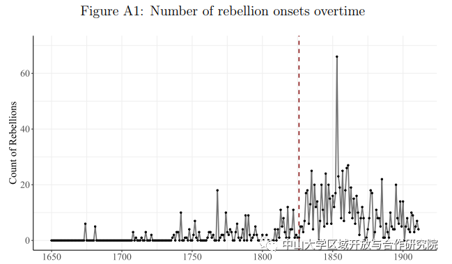叛乱发生的时间分布:在运河废弃后,叛乱的频率明显增加:从1825年前的每年1.37次增加到之后的每年10.47次。这个数字在1861年达到峰值(66次),并直到1870年代也没有下降。