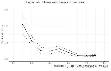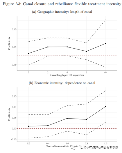 结果显示:运河废弃对整个分布具有显著的积极影响;且这种影响随分位数水平下降。即对于冲击前叛乱更多的县,运河废弃的影响更小。