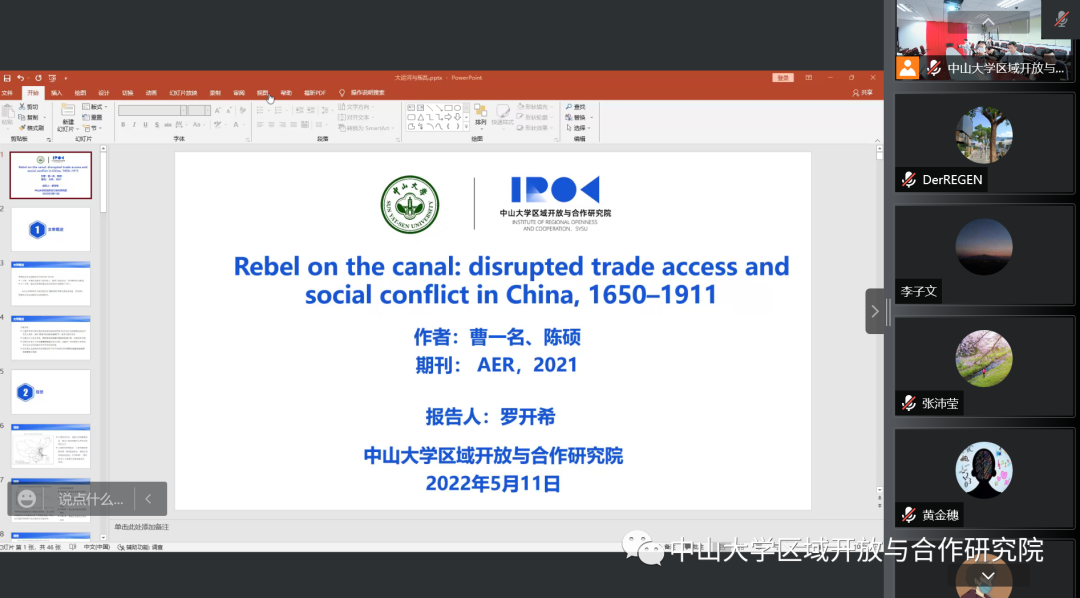 2022年5月11日晚18:30-20:00,中山大学区域开放与合作研究院文献研读会议以线上和线下相结合的方式成功举行。本次学习讨论会由罗开希硕士分享文献《Rebel on the canal: disrupted trade access and social conflict in China, 1650–1911》,该文于2021年发表在American Economic Review。参加学习讨论会人员包括毛艳华教授、李兵副教授、副研究员、博士后以及博士生和硕士生等,另有澳门科技大学、澳门城市大学博士生通过线上形式参与了本次学习讨论会。