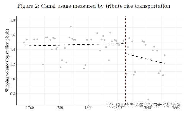 大运河的贸易效应:大运河推动贸易发展、提供就业机会,客观上使邻近地区受益。在1820年,“运河县”的人口密度比非运河县高出45%。