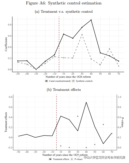 合成控制法:为每一个运河县构建一个加权组合,使得两者在冲击前的叛乱数量变化是相近的。图a显示了实验组和合成控制组的系数变化,图b显示了两者之差的变化。可以看出运河县在运河废弃后的叛乱数量增加了,这与基准回归的结果一致。