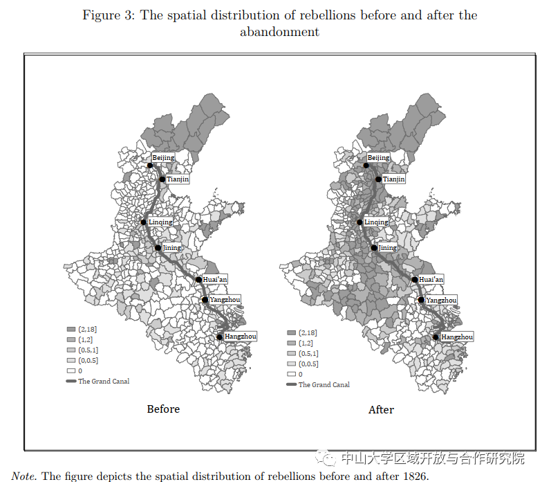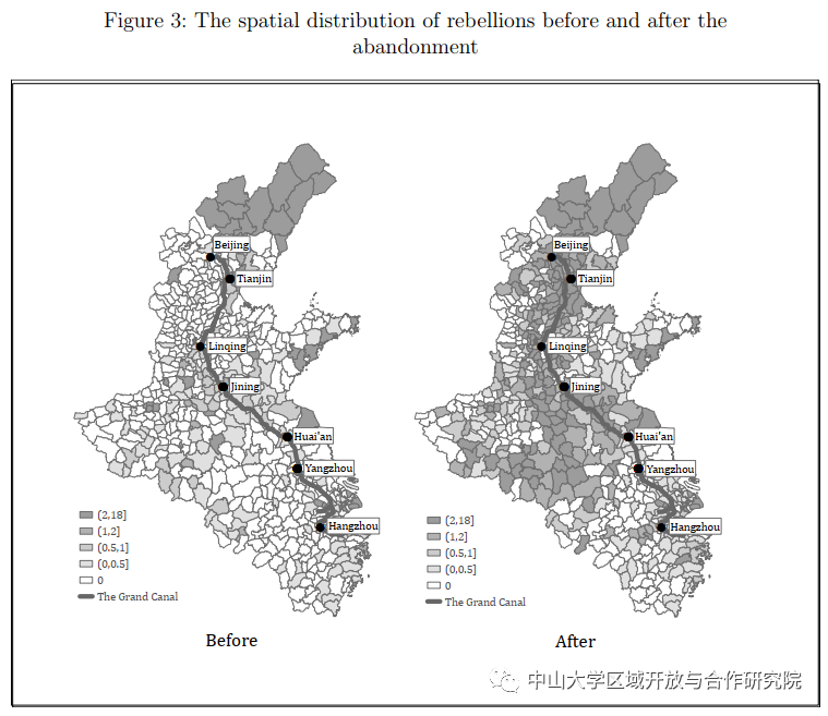 叛乱的空间分布:在运河放弃之前,叛乱的频率较低,但分布较广;废弃后叛乱的总数增加,且分布更为集中。值得注意的是,临近运河的区域,在冲击发生前后的相对变化更大。