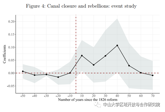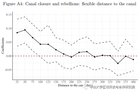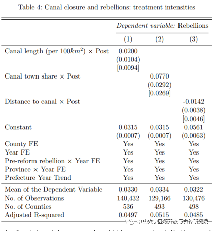 表4第(3)列表明:运河废弃对叛乱的影响随县与运河的距离增加而减小