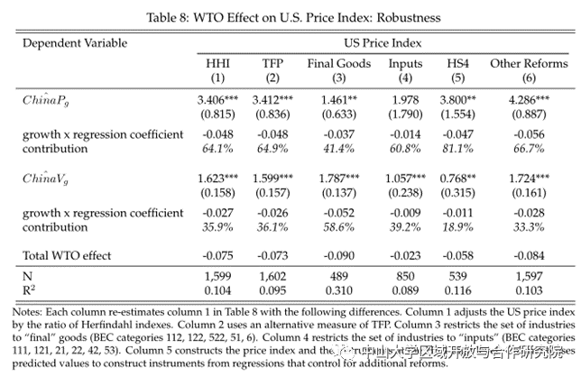 这篇论文首次表明,中国加入世贸组织对美国价格产生影响的关键机制是中国降低自己对中间投入的进口关税。中国降低中间投入品关税不仅直接降低了中国企业的成本,而且增加了中国企业进口中间投入品的价值和范围,提高了中国企业的生产率。更低的边际成本增加了进入美国市场的机会,降低了中国的出口价格,同时文章还研究了在加入WTO后给予永久正常贸易关系是如何影响中国出口的——这一渠道受到了很多关注——并与展示的文献一致,即永久正常贸易关系确实会导致更高的出口进入。但是,文章没有发现PNTR对中国企业TFP或出口价格的影响。通过综合考虑美国国内和其他国家对中国较低价格的反应,得出结论,中国自身关税的降低成为美国福利收益的一个重要来源。