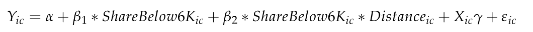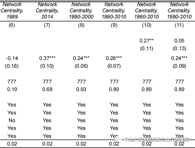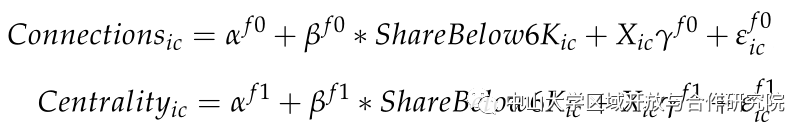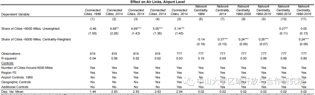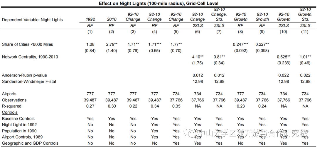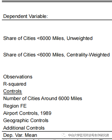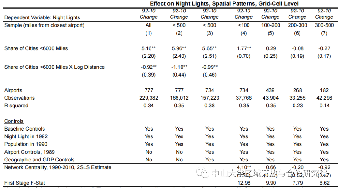 其中c表示网络单元,i表示同一国家内距离样本中最近的机场,ShareBelow6是工具(instrument)在最近的机场的值。如果连接促进了机场附近地区的经济增长,将为正。所有回归将在向量X中包括5500到6500英里之间的机场总数,根据基线规范中的网络中心度进行加权,以及网络单元c中心到机场i的对数距离,并进行区域固定效应以确保结果不受区域差异所影响,进一步控制人口等变量。
