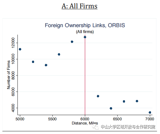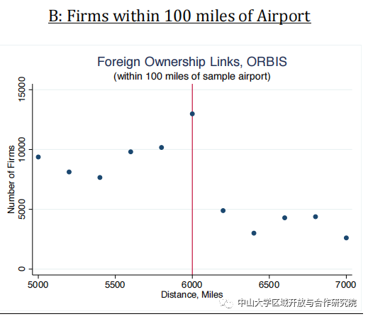 航线开通有利于运输旅客,从而可能扩大两地的FDI,这可以表现在一个地区中被其他地区公司持有的公司数量上。上图显示了使用ORBIS数据算得的距离在6000英里以内和以外的公司对数量存在明显不连续的情况,选取双方周围100英里内都有机场的子样本或以重要商务事件衡量商务联系。