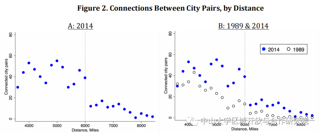 Filipe Campante 与 David Yanagizawa-drott利用国际航空联系的特点,利用断点回归方法检验了航空联系对经济发展的影响。结果显示,在航空网络内拥有数量多、质量好的航空联系可以带来更多的客流与商业联系,对经济增长具有促进作用,但这种正效应会随着距机场的距离增大而减弱。此外,将视野扩宽到全球资本流动层面,文章发现当其他地区的经济在航空联系帮助下顺利“起飞”的同时,贫穷国家却因缺乏建立航空联系的吸引力而被遗忘在“跑道”上。