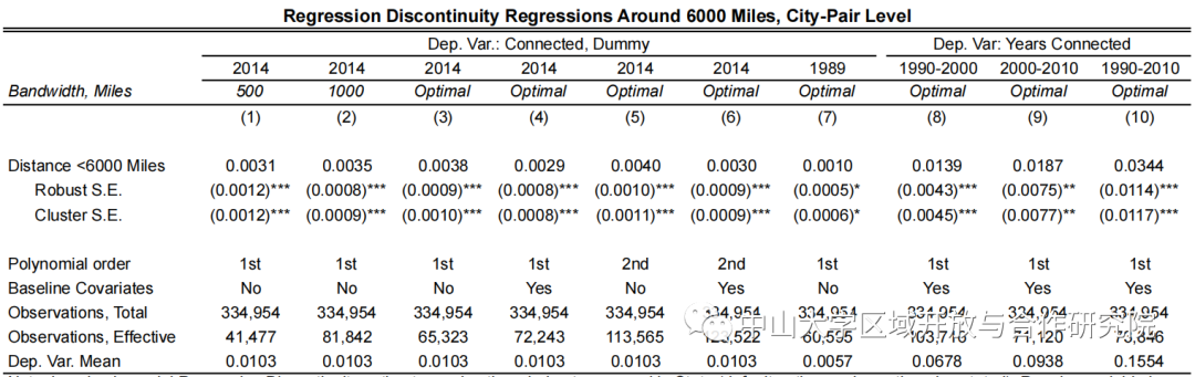 首先得出机场间距离对两地建立连接的可能性的影响,确定门槛距离的存在。结果显示距离6000英里以上与6000英里以下的城市相比,每周至少有航班连接的城市间的可能性要低0.3—0.4个百分点。可以得到相距小于6000英里的机场间更可能建立实际的航空联系。并通过改变带宽和增加控制变量的方法,增加进度,结果无明显变化。而从第(8)—(10)列可以看出,联系所带来的影响会随着时间的变化越发显著。随着20世纪80年代末和90年代的技术发展,这种不连续性迅速扩大,并随着时间的推移而进一步确立。