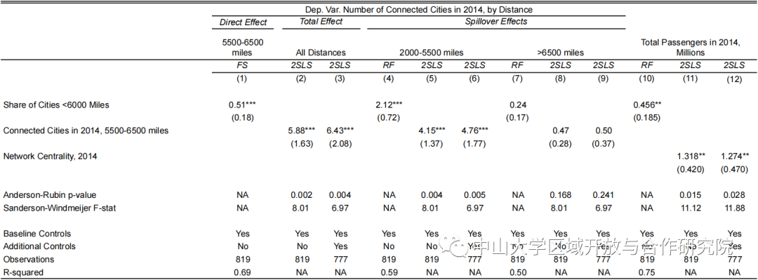 第(1)列显示,在5500—6500英里范围内,具有更好潜在连接的地方(略低于阈值)会增加更多连接。第(2)(3)列考虑了2SLS估计的额外连接在该范围内的影响,并发现了正向溢出效应。第(4)(5)(6)列和第(7)(8)(9)列对比,发现溢出效应基本来自2000—5500英里间的短距离范围。总而言之,拥有更多直飞航班会增加与其他机场连接的价值,从而促进进一步连接。