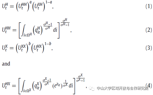 其中 H 表示国内市场,X 表示国外市场,i 表示提供品种 i 的公司,ΩH(ΩX) 表示市场 H (X) 中可用品种的集合。家庭效用有两个组成部分:来自消费国内商品的部分