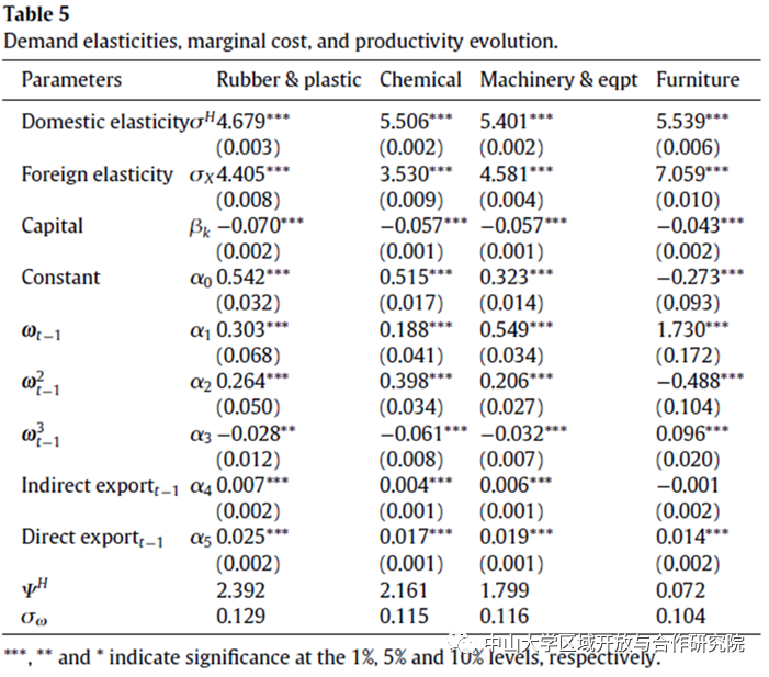 上一期间接出口状况的系数 α4 和上期直接出口状况的系数 α5 表明出口对生产率的显示正向影响。间接出口商的生产率比非出口商高 0.5%,直接出口商的生产率比非出口商高 2.0%,且α5 的大小是 α4 的四倍,这意味着直接出口比间接出口对生产率的影响更大。直接出口在生产力发展中具有更大的边干边学效应,并会导致来自本地市场回报和国外市场回报的更高预期未来回报。