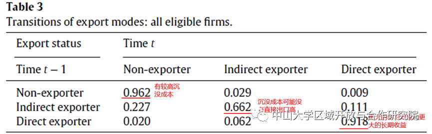 表3第 1 列显示了公司在 t-1 年的出口状态,第 2-4 列显示了 t 年的三种可能状态的转换率。