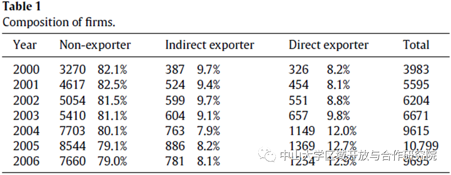 表1结果表明:在橡胶和塑料制造行业,平均来看,82.9% 的公司为非出口商,7.7% 为间接出口商, 9.4% 为直接出口商。表明出口成本可能相当高。尽管公司的数量大幅上升,随着时间的推移,非出口公司的份额一直保持稳定。但是,间接出口企业的比例从 9.7% 下降到 5.3%,直接出口企业的比例从 7.6% 上升到 11.3%。