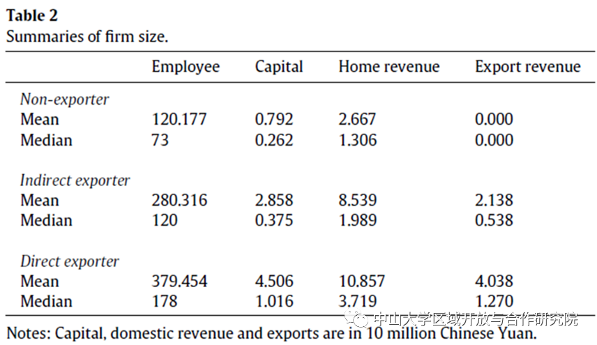 表2从就业、资本存量、国内收入和出口收入来衡量公司规模。从就业来看,间接出口商的平均规模是非出口商的两倍多,而直接出口企业的平均规模是非出口商的三倍多。资本存量、国内收入和出口收入也有着类似情况。