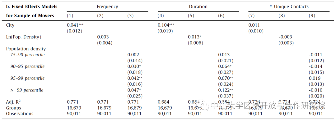 表6 Panel(b)为固定效应模型结果,由于无法证明该结果可能是因为社交能力强的人进入城市造成的,所以Panel(b)把样本限制在2015年7月到2016年4月间曾经改变过他们的居住地的人,这样可以控制个人的特质。可以看出,Panel(b)的系数明显比Panel(a)小很多,但是结果还是保持不变的。这更进一步说明手机联系与面对面交流的互补性,且即使控制了个人的特质,人口密度对手机通讯的正向影响仍然是显著的。
