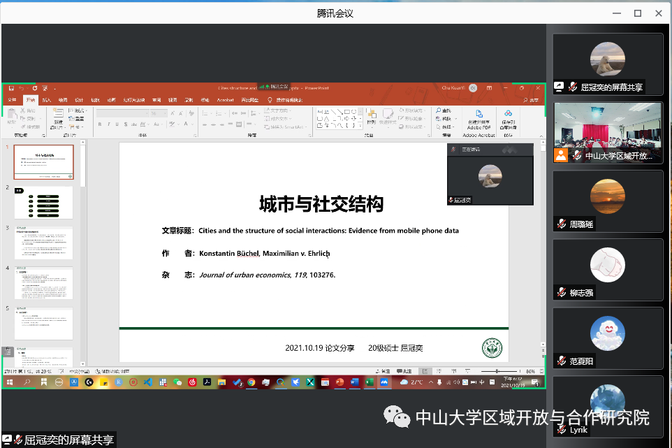 2021年10月19日晚18:30-20:45,中山大学区域开放与合作研究院文献研读会议以线上和线下相结合的方式成功举行。本次学习讨论会由硕士生屈冠奕同学分享文献。参加学习讨论会人员包括毛艳华教授、李兵副教授、副研究员、博士后以及博士生和硕士生等,另有澳门科技大学、澳门城市大学博士生通过线上形式参与了本次学习讨论会。