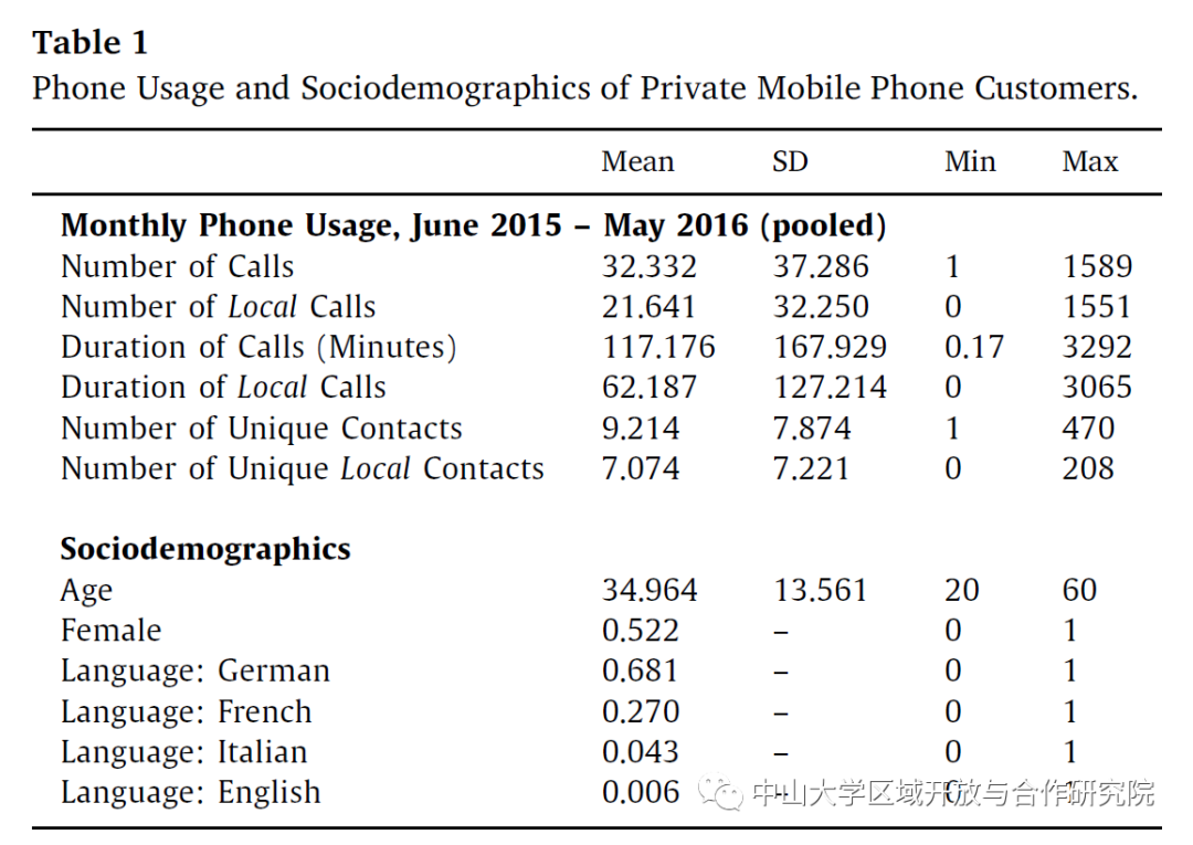 Table1显示15-64岁手机使用情况汇总统计数据,包含特定联系人数量、通话频率、持续时间测量的互动强度,以及通话是否发生在呼叫者catchment area内。可以看出统计对象平均每天打1.2个电话,平均时常4分钟,平均每位用户有9个特定联系人,而且大约65%属于本地通话(打给住在15分钟车程的人)。
