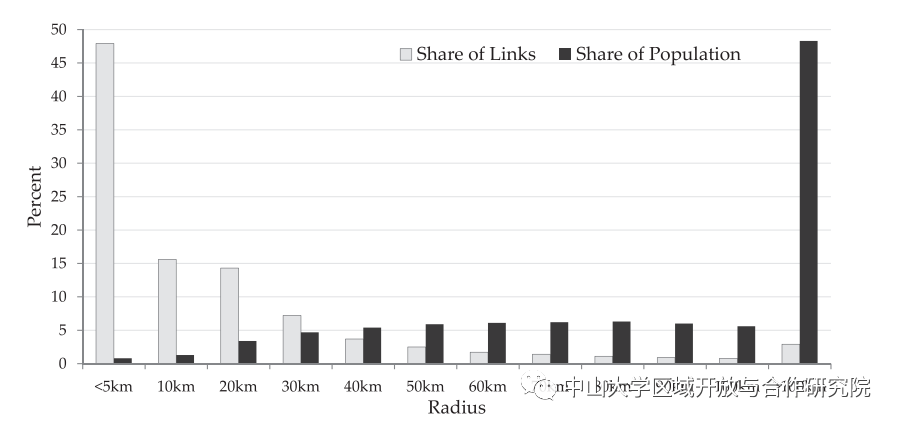 下图显示了手机联系占比和人口占比的关系。可以发现,几乎50%的联系是在小于5公里的范围内的,占了不到1%的人口。也就是说住在越近的地方的用户越喜欢用手机联系,住的远了反而用手机联系的次数减少。但是这张图既没有考虑同类型的人可能住在一起的问题也没有说明距离的重要性。因此参考此前提出的模型继续分析。