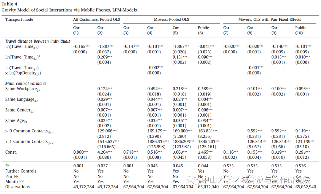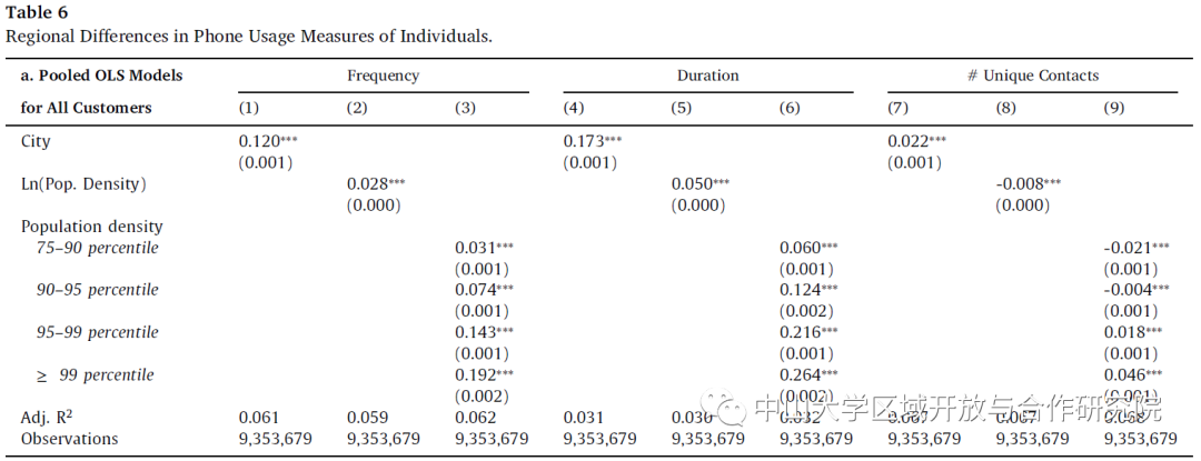 此时已产生6种与手机使用相关的变量,其中3个与所有手机通话相关另外3个只与本地通话相关,也就是手机帐单收信地址15分钟路程范围内相关(即catchment area)。以下进一步论证面对面交流与手机联系的互补性。从经验判断来看,人口密度较高的地区,见面的成本比较低,因此大家更愿意跟别人一起活动。同时,也有可能互动的场景更多的从线上转到线下。如果城市的手机联系程度明显高于人口较低地区,那么第一种效应主导,则不论手机联系还是面对面交流,在城市都是较多的。